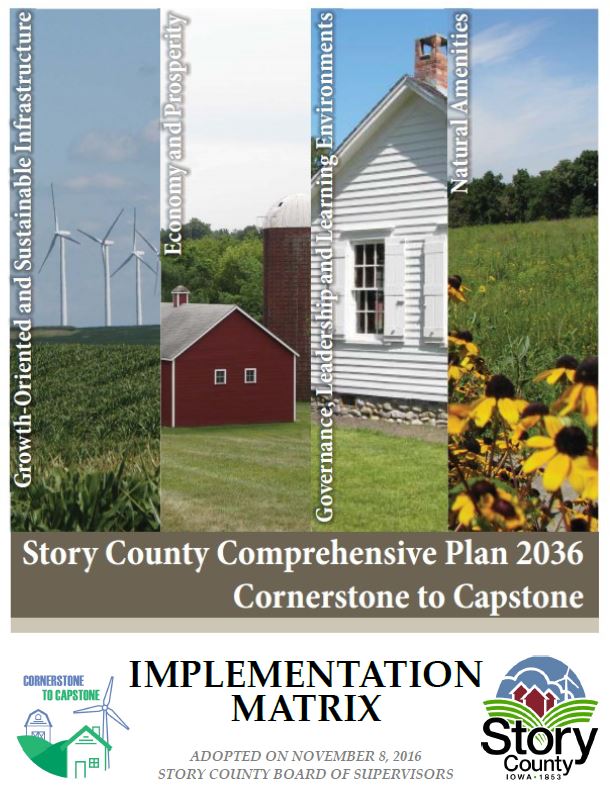 This Implementation Matrix (PDF) describes how the policies and actions in the C2C Plan should be carried out. It provides recommendations for administering the planning process and enhancing linkages between the C2C Plan, Strategic Plan, and the Capital Improvement Program (CIP). It recommends steps to monitor, evaluate, and update the Plan on a regular basis. Story County does a number of existing action items. The County fully intends to continue to do these action items, but while they are in the C2C Plan, they are not identified in this Implementation Matrix (PDF). These action items are already being implemented, and, as such, built into existing work programs and other plans.