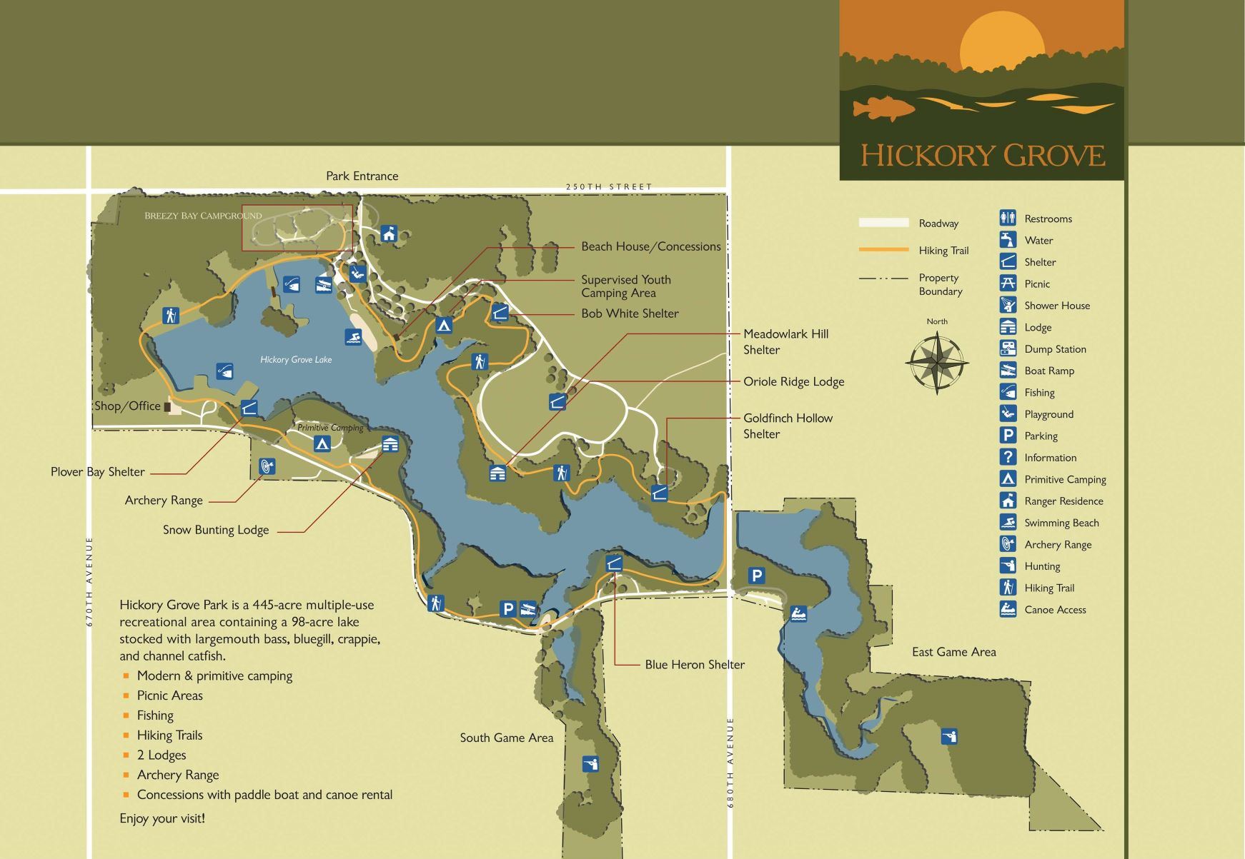 A roughly three-mile, crushed limestone trail wraps around Hickory Grove Lake.
