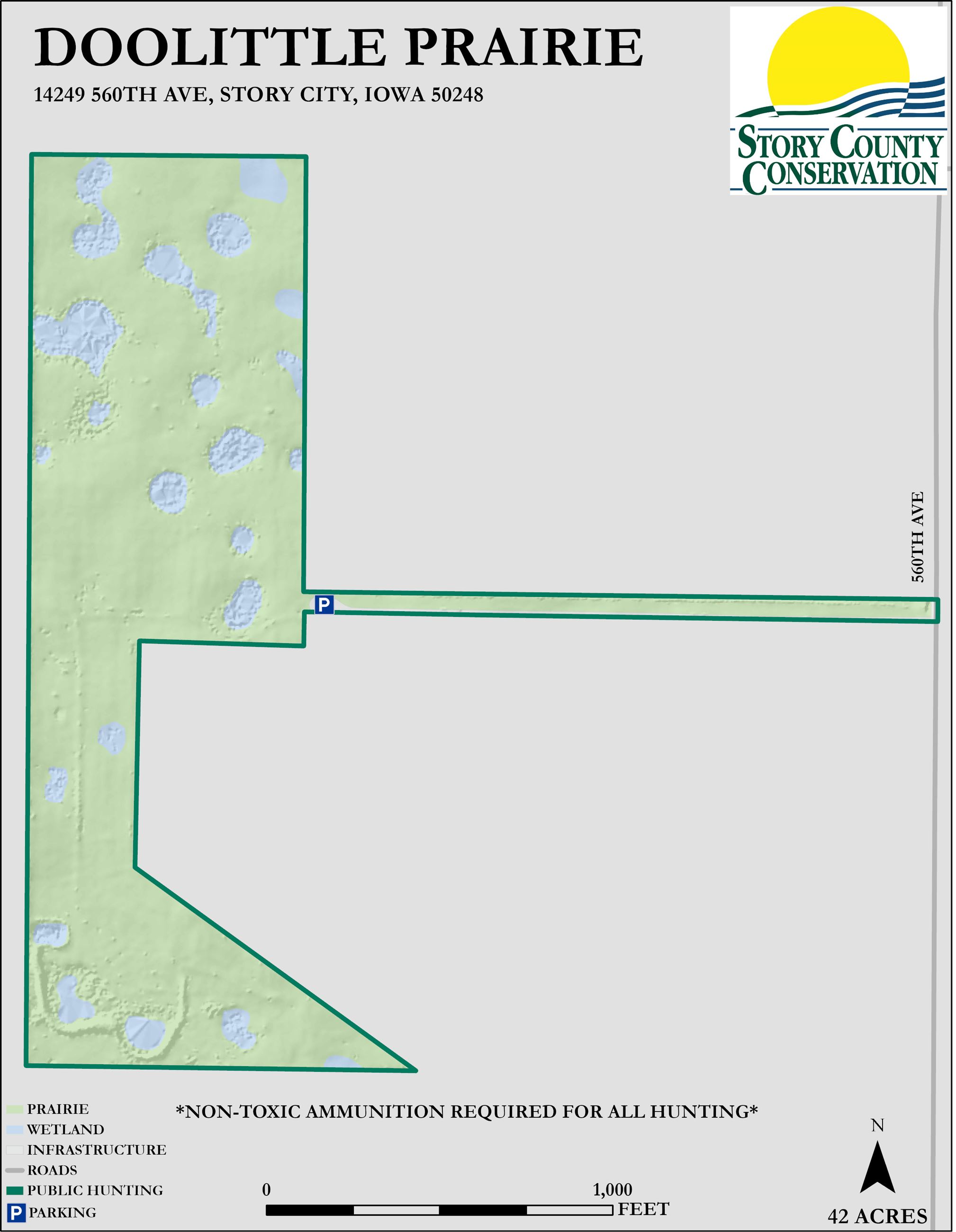 Hiking, walking, bird watching, and several other activities are possible however we do not maintain trails nor do we have picnic tables or grills available. Doolittle Prairie is a designated public hunting area; no target practice is allowed; only non-toxic shot is allowed.