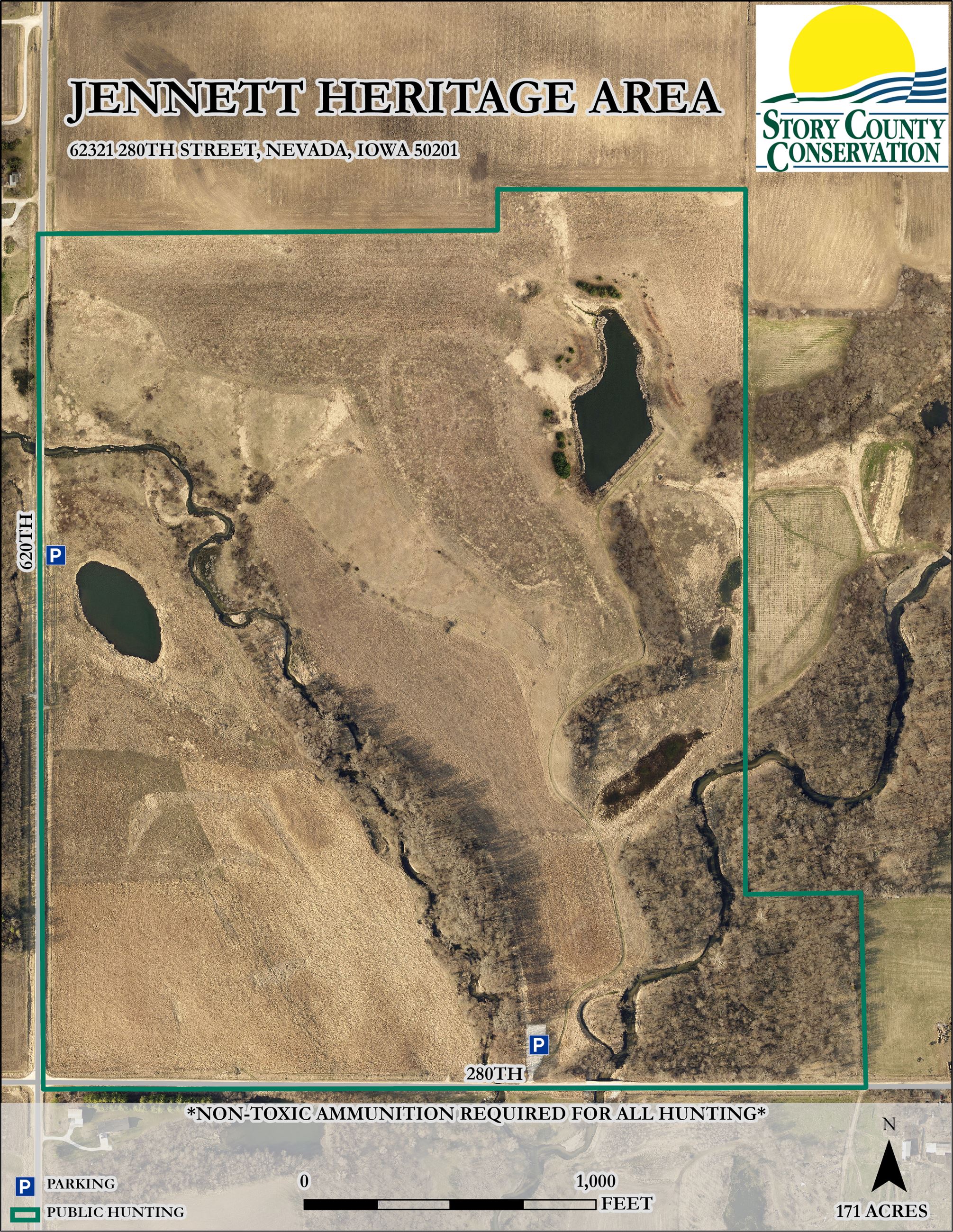 Hiking, walking, bird watching, geocaching, and several other activities are possible however we do not maintain trails nor do we have picnic tables or grills available. Jennett Heritage Area is a designated public fishing area and public hunting area. No target practice is allowed. Only non-toxic ammunition is allowed.