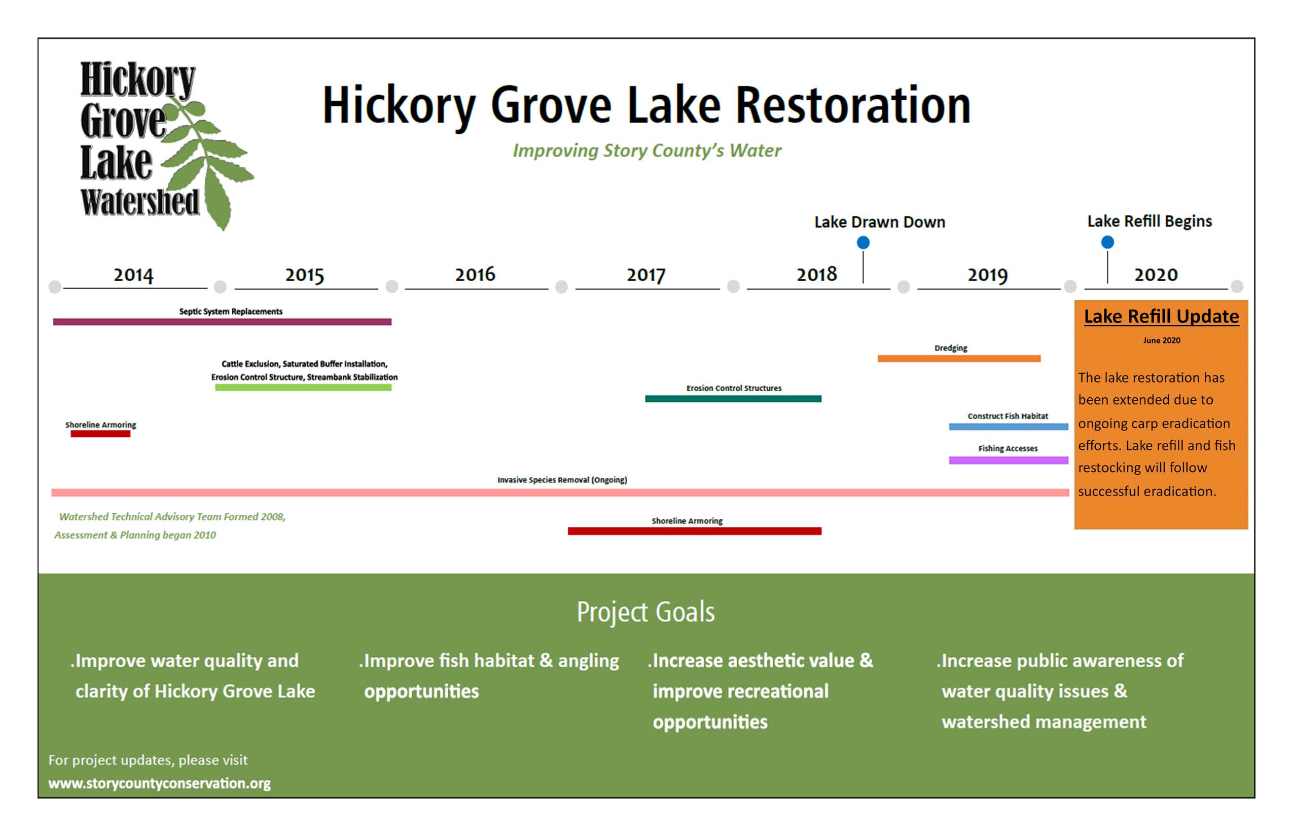 - Improve water quality and clarity in Hickory Grove Lake